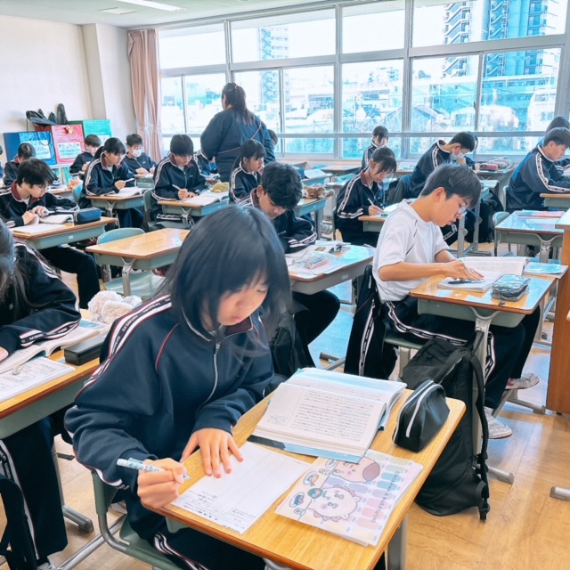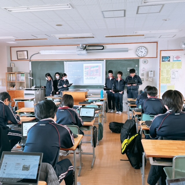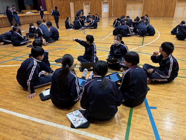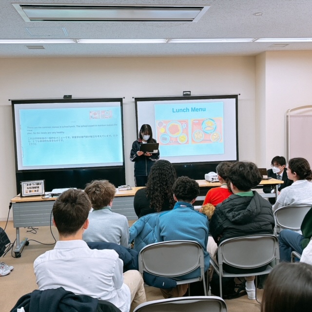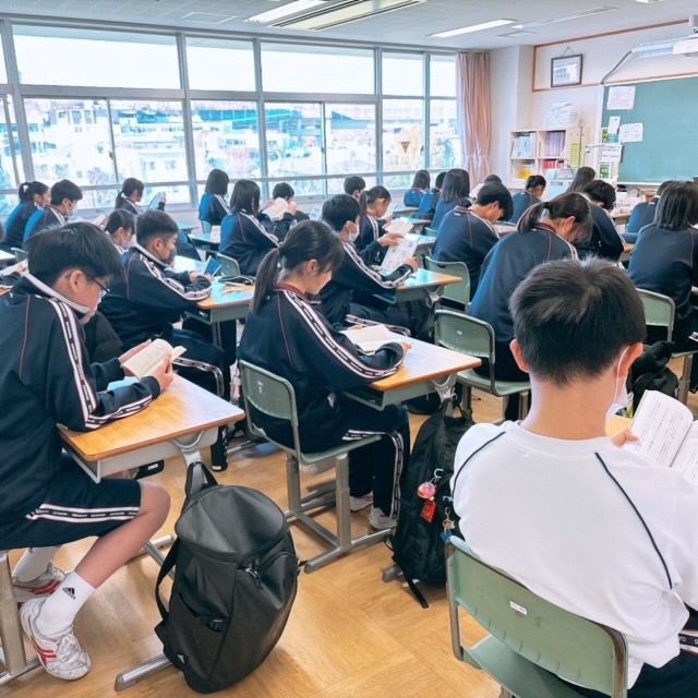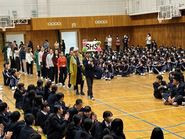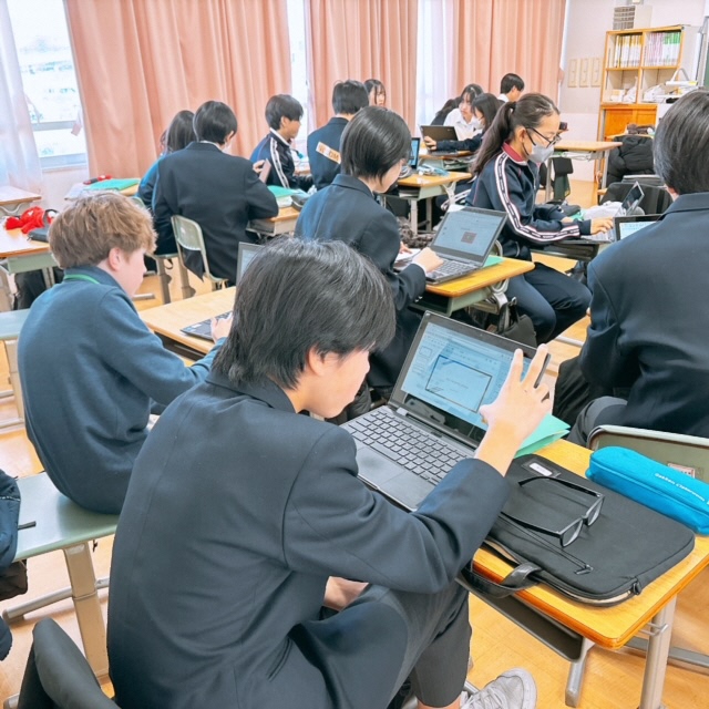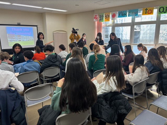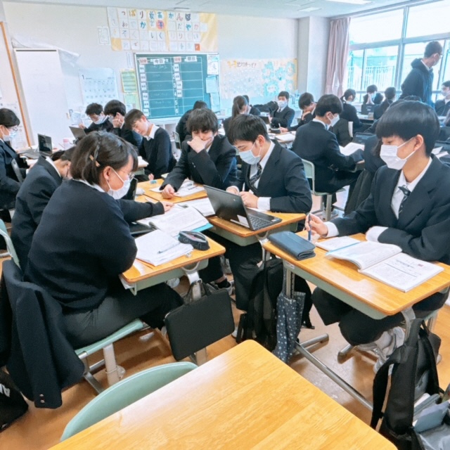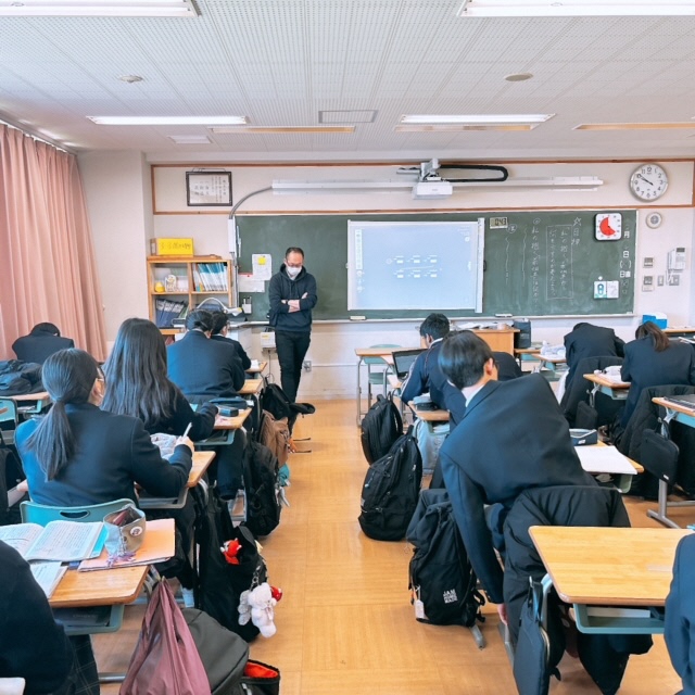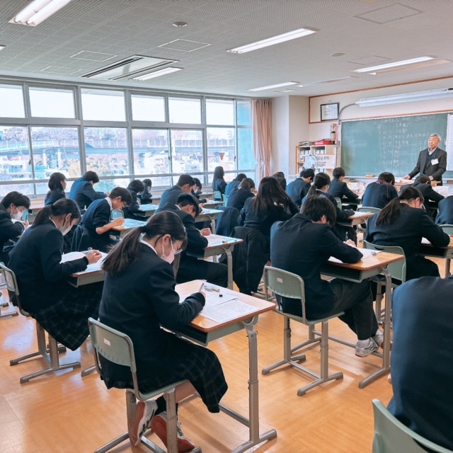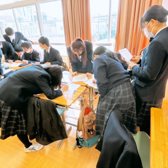 昨日に引き続き、セブンヒルズスクールの生徒が本校を訪れました。今日は海外派遣生徒のご家庭に先週からホームステイしている生徒さん4名が来校し、1日授業体験をしました。日本の授業を受けるのは初めての体験だったと思いますが、とても楽しんで授業を受けている様子にホッとしました。昼休みには校庭でバスケットボールを楽しんでいる姿もありました。さて、校内を廻ると受験シーズン中の3年生が頑張っている様子に出会いました。音楽の授業では、早くも3月19日の卒業式に向けて校歌や[式歌]の練習に取り組んでいました。もともと歌うことが好きな3年生なので、とても楽しそうにパート練習をしていました。公民の授業では[これからのわが国のエネルギー政策のあり方]について熱気溢れるクラス討議が行われていました。卒業を前にしてこれからの社会で〈正解がない問い〉をどのように探究していくか?〈自分事として考える〉ことの大切さを学ぶことができたようです!