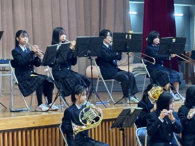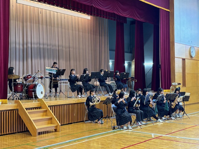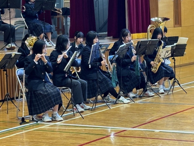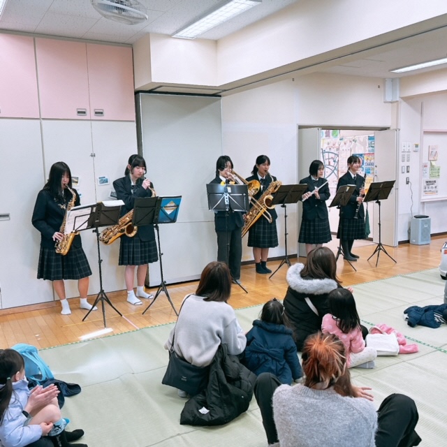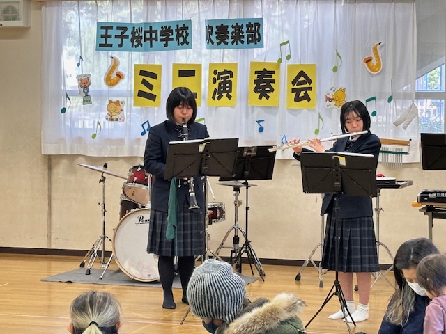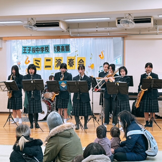 先週の金曜日は王子小学校の【音楽朝会】で本校の吹奏楽部がミニ演奏会を行いました。演奏曲はジブリやアニメの曲など小学生が日頃親しんでいる曲ばかりです。体育館に集まった全校児童に曲紹介があると皆さんの目が一気に輝くのがわかりました!演奏後はインタビューコーナーもあり小学生の皆さんと中学生部員の交流が深まりました。翌土曜日には王子東児童館でも恒例となった吹奏楽部による【ミニ演奏会】が行われました。乳幼児の親子連れが次々とホールに入ってくるのを部員の皆さんはニコニコと笑顔で迎えました。こちらも人気のある曲ばかり7曲の演奏です。音楽に合わせて体を揺らしながら楽しそうに聞く親子連れの姿を見て、こちらも幸せな気持ちになりました。この子たちの中から将来王子桜中の吹奏楽部に入ってくれる子が出るのでしょうか?こうした期待感も高まりました!これからも地域の子どもたちを笑顔にできるボランティア活動を続けていきたいと思います。吹奏楽部の皆さん、ありがとうございました!