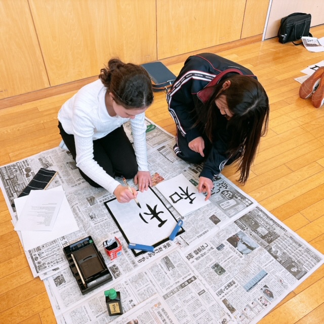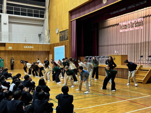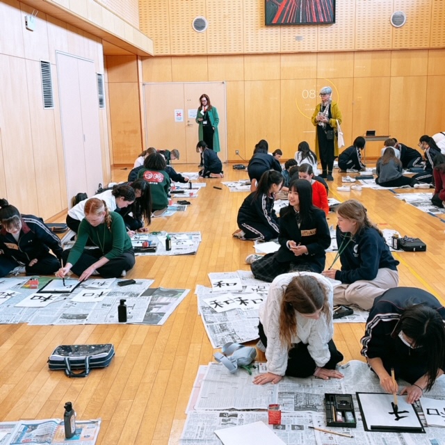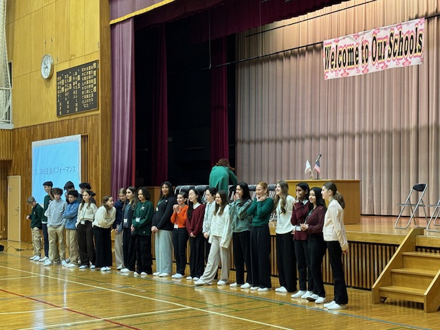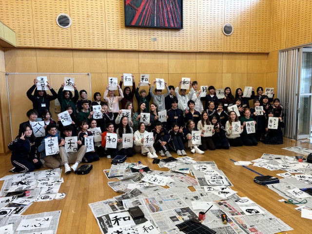 今日はアメリカから来日しているセブンヒルズスクールの生徒の皆さん(23名)の学校訪問がありました。朝王子街道でお迎えした後は、王子小6年生と全校生徒が一緒に体育館で[歓迎会]を行いました。それぞれのスピーチのあと、セブンヒルズスクールの皆さんから校歌とダンスパフォーマンスの披露がありました。日本の小中学生も手拍子で盛り上がり、会場の雰囲気が一気に一体感に包まれました。歓迎会の後は、生徒会役員から日本のスクールライフの紹介が行われました。もちろんすべて英語です。質疑応答では「好きな給食は?」や「好きな授業は?」などの質問が相次ぎ、生徒会役員が英語で答えていました。アメリカの中学生の質問力の高さに感心しました。2時間目は王子ホールに移動し[書道体験]を行いました。2年生の有志生徒がミニティーチャーとなって、英語で毛筆の使い方をレクチャーしました。イングリッシュキャンプの経験を生かして、積極的にコミュニケーションを取っている姿が頼もしく見えました。最後は[記念の一枚]を手に全員で集合写真を撮って、中学校での学校体験を終わりました。今日という日が、日本での大切な思い出になってくれるとうれしいです!